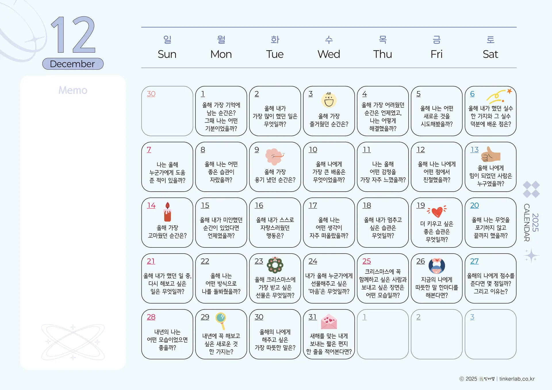 3️⃣26~31일 : 새해를 준비하는 질문들이에요. 한 해를 마무리하고, 올해의 나를 칭찬해주며, 내년에는 어떤 모습일지 생각해보아요. 새로운 해를 설레는 마음으로 맞이할 수 있도록 해요.